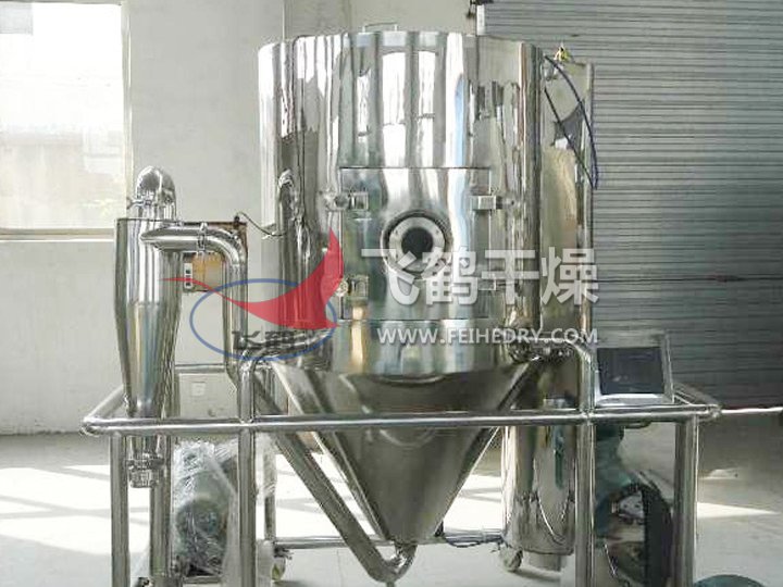 该机采用全封闭形式,所有部件均采用不锈钢制造,配有三级净化装置,过滤后的空气达十万级要求。筒体与顶部装有冷壁装置,使壁温<80℃,干燥塔内装有气刷扫塔装置。经该机干燥后的中药浸膏粉,不会出现焦化变质现象,大大增加了收粉率(95%以上),而且不会产生混药现象和粘壁现象。