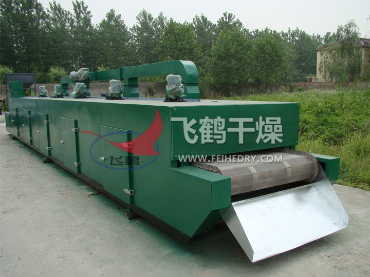 物料由加料器均匀地铺在网带上,网带一般采用12-60目不锈钢丝网,由传动装置拖动在干燥机内移动。干燥机由若干单元组成,每一单元热风独立循环,部分尾气由专门排湿风机排出,废气由调节阀控制,热气由下往上或由上往下穿过铺满物料的网带完成热量与质量传递的进程,带走物料水份。网带缓慢移动,运行速度可根据物料温度自由调节,干燥后的成品连续落入收料器中。上下循环单元根据用户需要可灵活配备,单元数量亦可根据需要选取。
