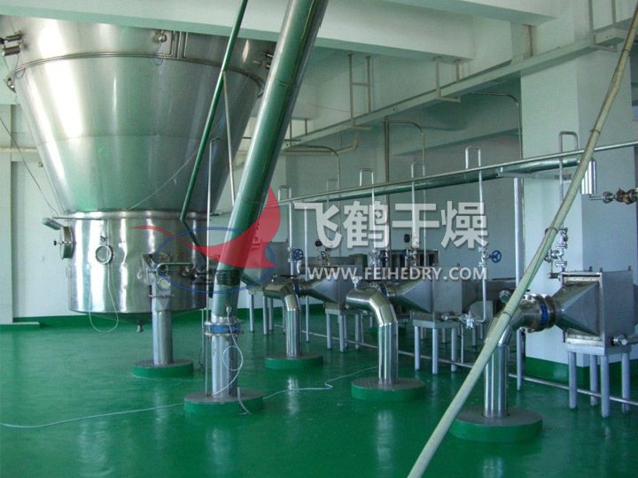 该生产线由供料系统、介质循环系统、空气加热净化系统、干燥塔系统、收料系统、控制系统等多个系统整合而成。主塔系统集中了目前喷雾干燥工程的所有尖端技术,喷干机组的收料系统由一级旋风分离器+布袋除尘器组合形成。一级旋风采用高气量高效率旋风进行收集,其收粉率能达到96%左右分,而布袋除尘器是针对蛋白粉类除尘专门设计的优化设备,能使物料与风进行完全分离并沉降,布袋为拒水防油防静电布袋,过滤目数可达500目以上。